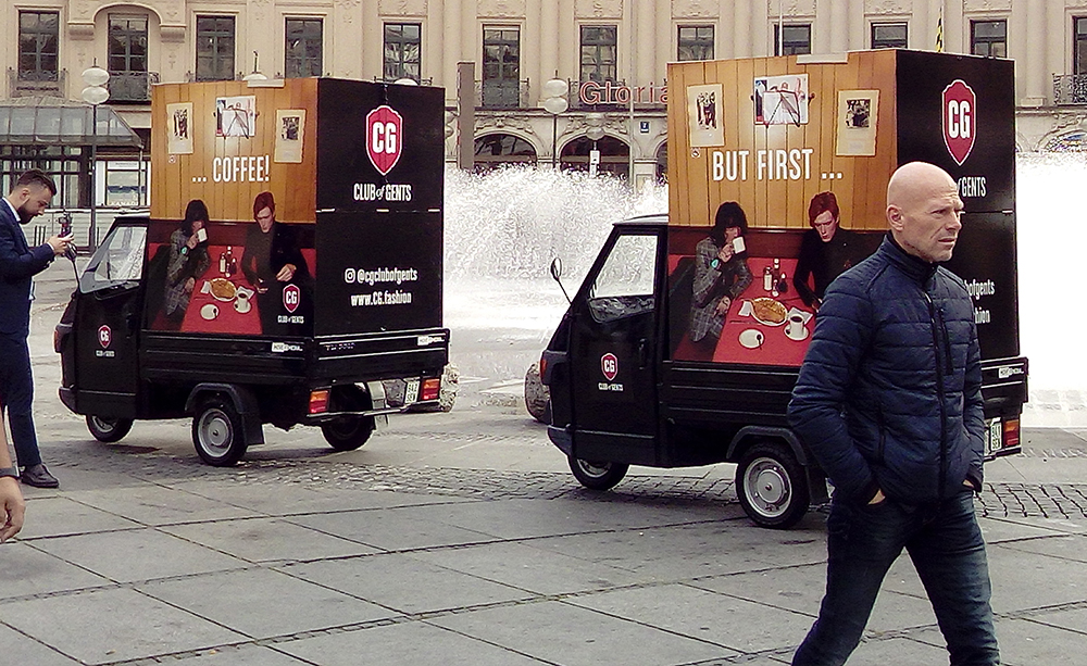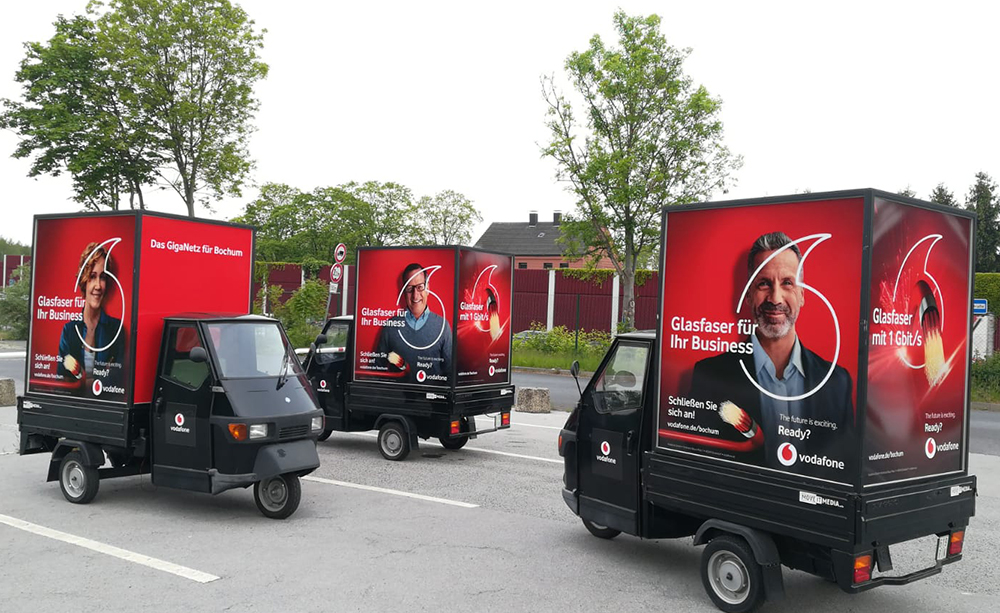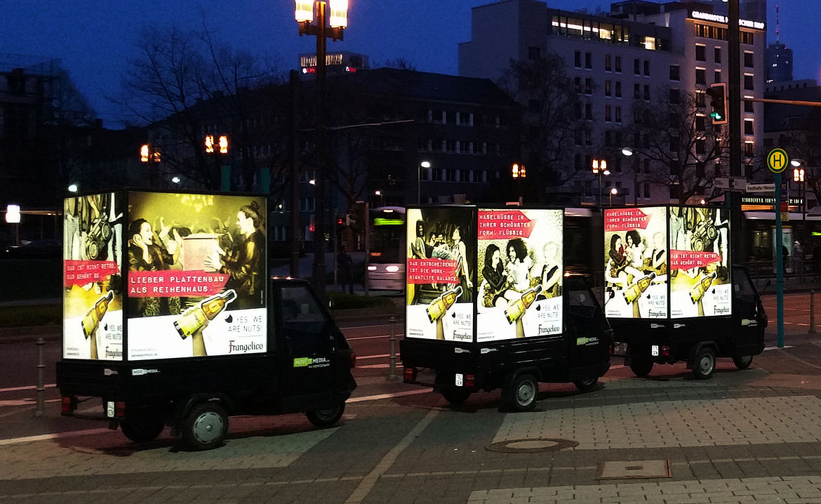 Vielen ist das dreirädrige Rollermobil Ape aus Italien bekannt. In unserem Stadtbild ist der sympathische Flitzer eher eine Rarität. Im Konvoi und mit auffällig gebrandetem Aufbau bleibt er auf jeden Fall im Gedächtnis. Vier hinterleuchtbare Werbeflächen schaffen auch in der Dunkelheit höchste Aufmerksamkeit. Die modularen, flexiblen Werbeaufbauten bieten großen kreativen Spielraum für individuelle Gestaltungen. Sonderaufbauten sind jederzeit möglich.