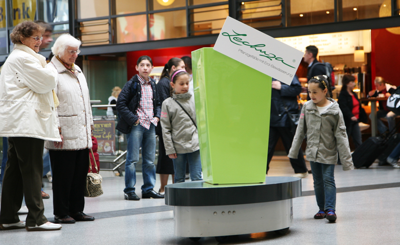 Dieses Medium scheint selbstständig über den Boden gleiten und intelligent auf die Passanten reagieren zu können. Das macht sofort neugierig. Ob in der Fußgängerzone, am Bahnhof, auf Messen oder Events – steuern Sie Ihre Zielgruppe direkt an! Der ferngesteuerte, beleuchtete PosterMover (CityLight-Format) bringt Ihre Werbebotschaft direkt zu den Passanten und steht sofort im Mittelpunkt. Kein Werbeträger löst so viel Amüsement aus!