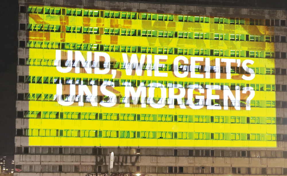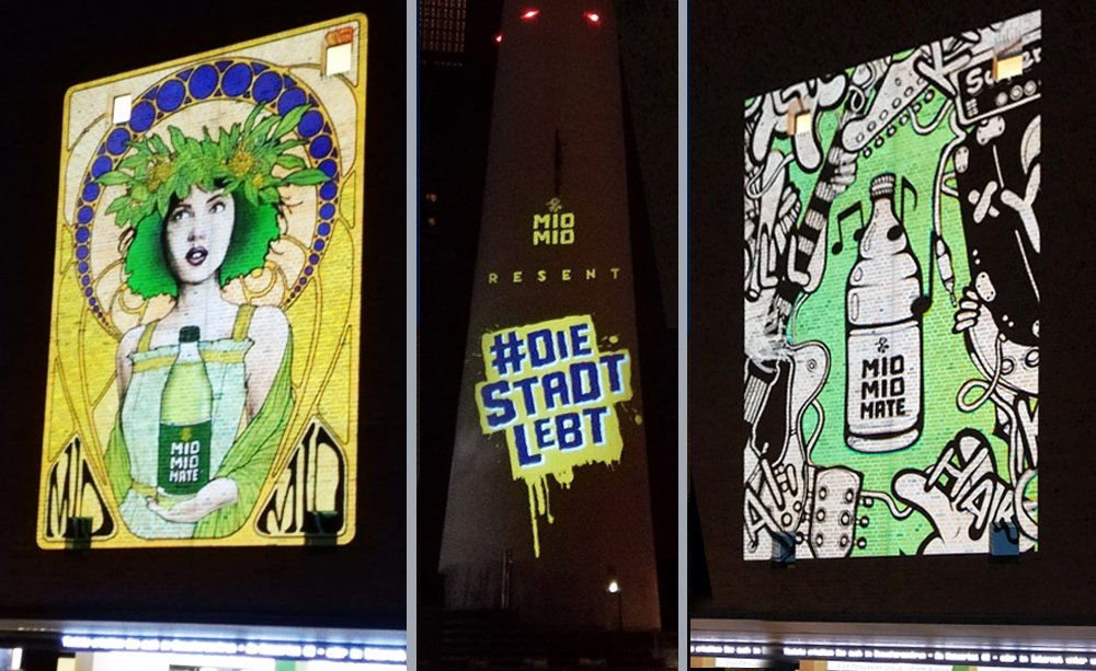 Sobald es dunkel wird, werfen wir Ihre Werbebotschaften mit unseren mobilen Hochleistungsbeamern exklusiv an zentrale Flächen in City und Szene: Gebäude, Fassaden, Böden, Bäume etc. Wir belegen für Sie ausgewählte Locations dauerhaft oder führen überraschende Aktionen mit kurzfristigen Standortwechseln im ganzen Stadtgebiet durch. Für Promotion-„Naheinsätze“ werben unsere WalkingBeamer mit kleinerer Projektionsfläche in der Szene. Mit diesen überraschenden Einsätzen können Promotions gehighlightet werden.