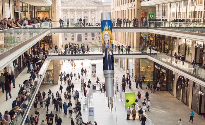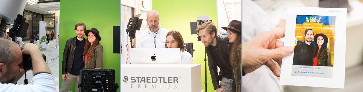 Der individuellste Füller der Welt: In Berlin wurde der Corium Individuum von STAEDTLER PREMIUM originalgetreu im 15 Meter großen XXL-Format wirkungsvoll in Szene gesetzt. Der individuell bedruckbare Lederschaft wurde durch eine runde LED Wand dargestellt, auf der die persönlichen Motive der Kunden und Passanten rotierend gezeigt werden konnten. Wer kein Foto dabei hatte, konnte sich vor einem GreenScreen fotografieren lassen und erschien bald darauf vor dem Hintergrund seiner Wahl auf dem eindrucksvollen Riesenfüller.