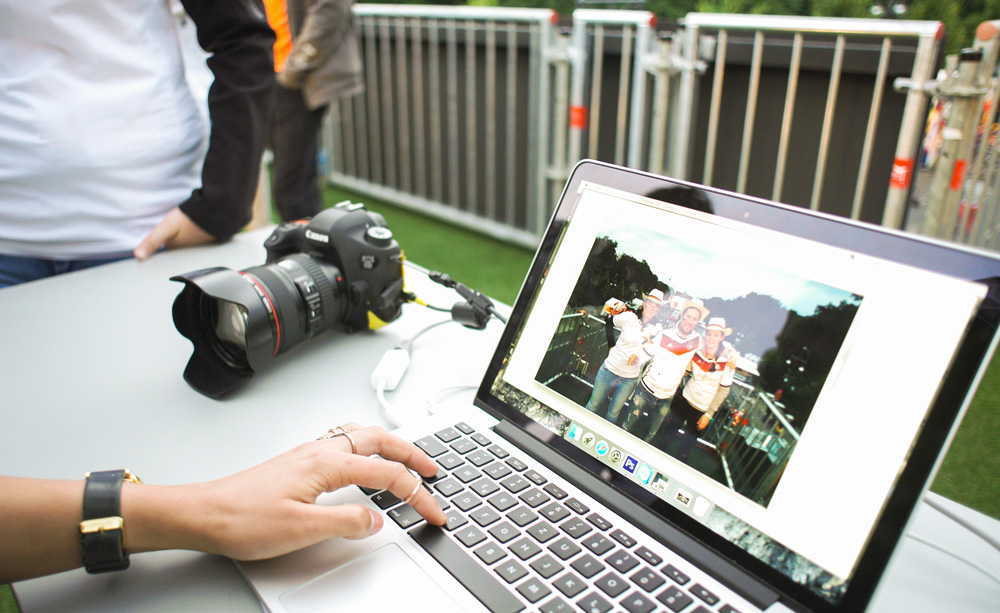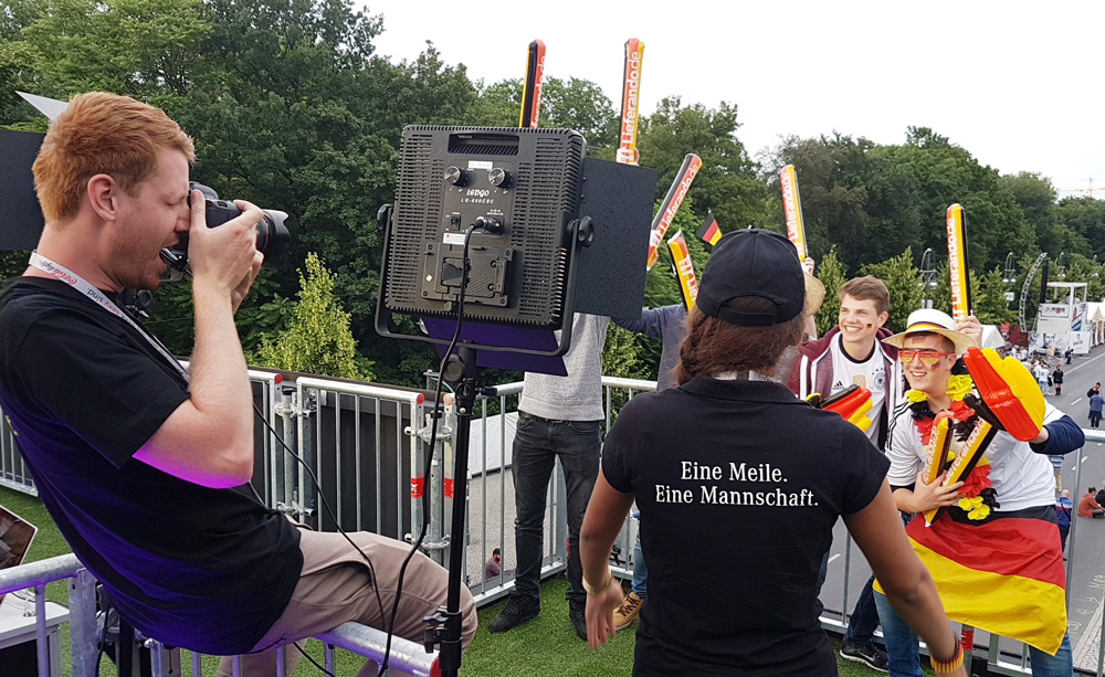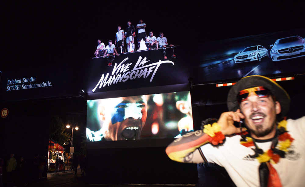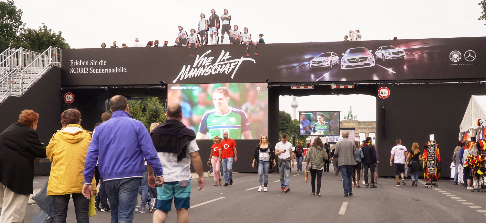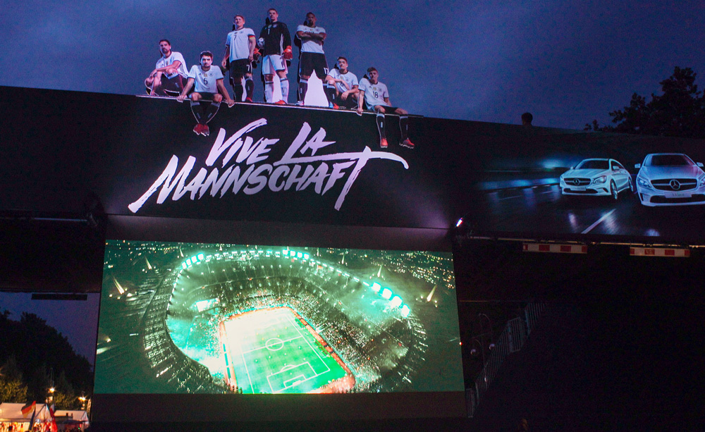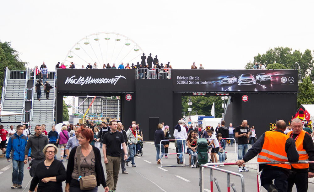 Daimler wollte die Fans aus aller Welt besonders eindrucksvoll bergüßen. Mitten auf der größten Fanmeile Deutschlands errichtete MOVE it MEDIA ein imposantes Bauwerk: eine 17 Meter breite und 6 Meter hohe Brücke, auf der eine Silhouette der prominentesten Nationalspieler thronte, gewährten dem internationalem Publikum nicht nur einen einmaligen Blick auf die tosenden Massen vorm Brandenburger Tor. Zur Erinnerung konnten sich die Fans auf der Brücke mit Accessoires geschmückt vor einem herrlichen Panorama fotografieren lassen und das Foto gleich mitnehmen oder per Mail über eine eigens dafür eingerichtete Subside zusenden lassen. Zahlreiche Fans aus aller Welt standen Schlange und waren begeistert. Von Fußball, Berlin, der Fanmeile und von Daimler.