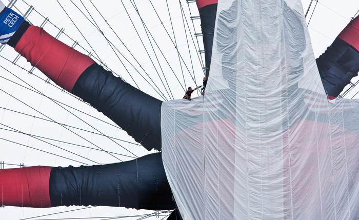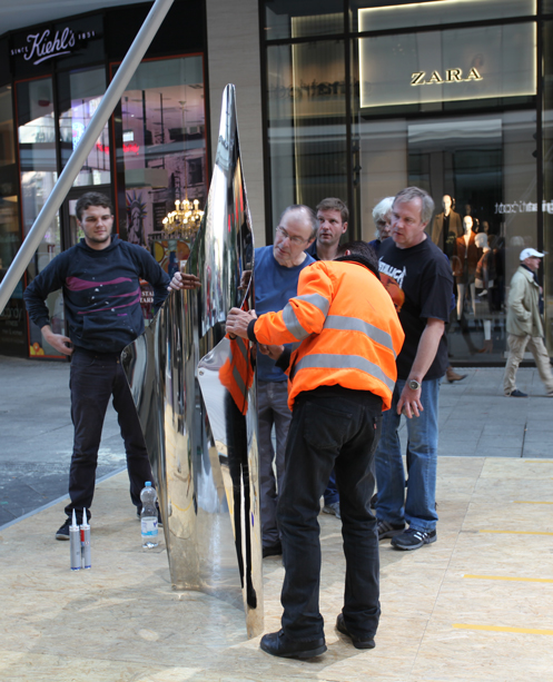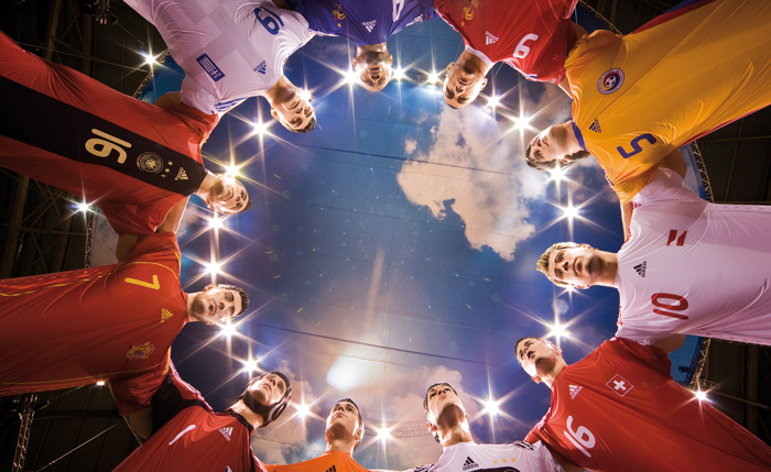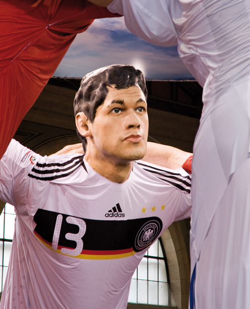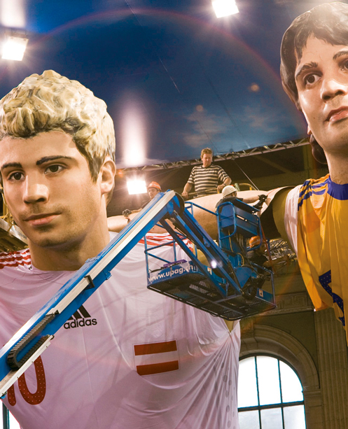 11 riesige Fußballhelden, einer aus jeder Nation, umarmen sich im Züricher Hauptbahnhof! 5 Monate hatten die Vorarbeiten gedauert, die Spieler wurden bei ihren Vereinen besucht, fotografiert und gescannt, um in Computerfertigung die Riesen genau dem Original getreu anfertigen zu können – unter Beachtung strenger statischer und feuertechnischer Auflagen. Trotz lediglich 7-tägiger Aufbauzeit im belebten Züricher Hauptbahnhof standen die Spieler zum Anstoß der EURO bereit und erfreuten 100.000e Passanten durch ihren imposanten Auftritt.