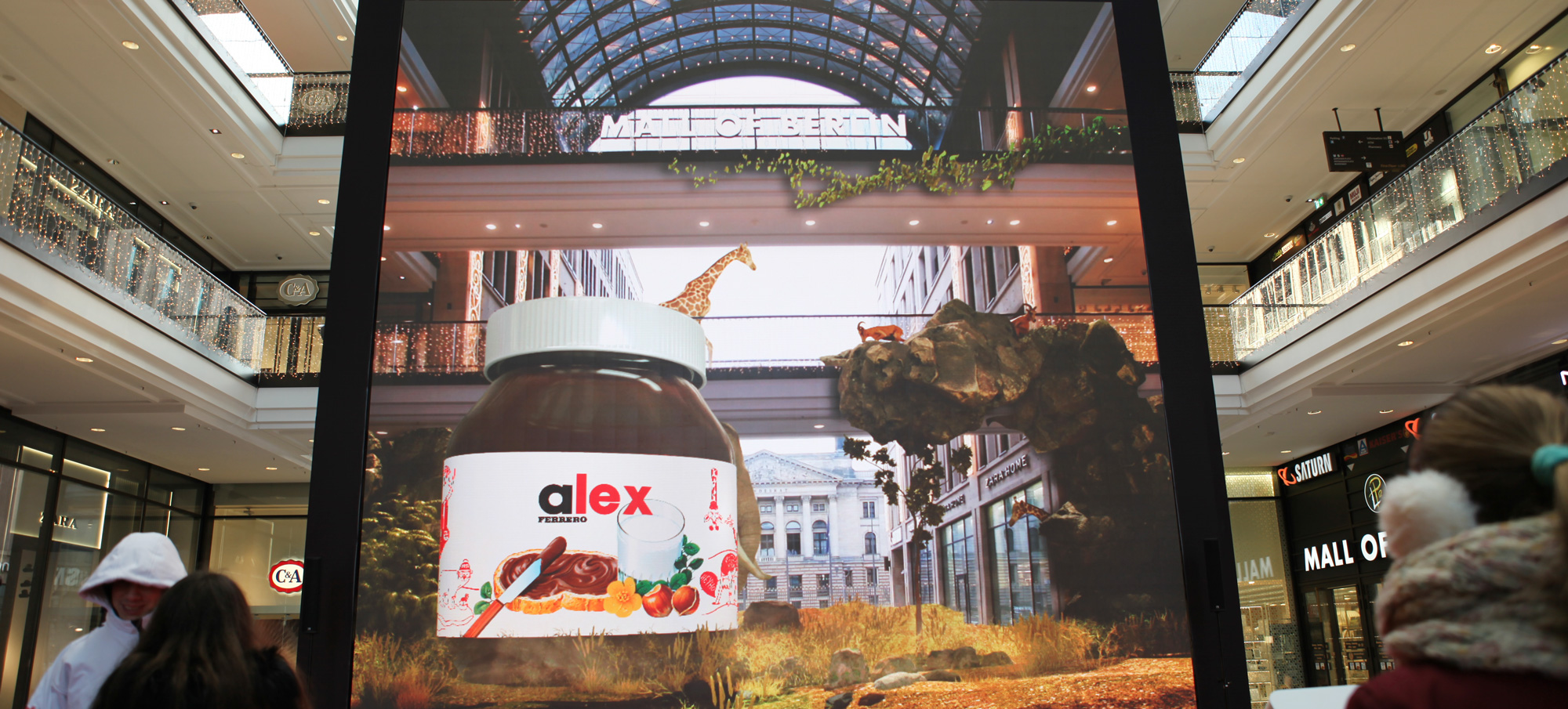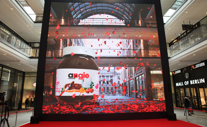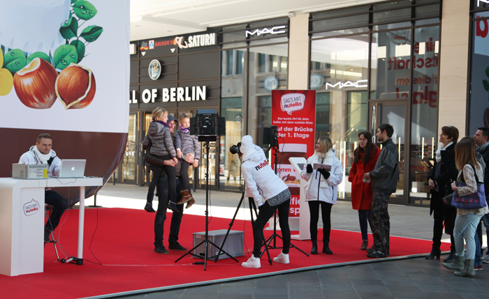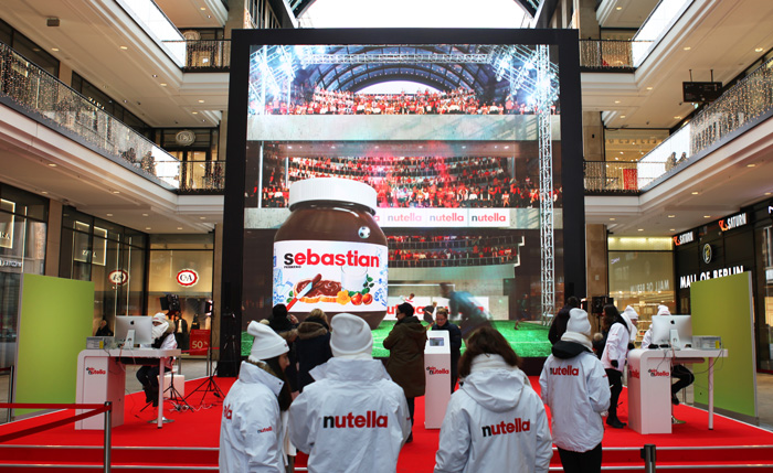 Januar 2017 in Berlin: Die Mall of Berlin am Leipziger Platz verwandelte sich für 14 Tage in eine faszinierende nutella-Welt. Der 100 Quadratmeter große, hoch auflösende LED-Screen ließ die Besucher beeinduckende Szenerien erleben. Virtuelle Party People verwandelten die Mall in einen Club, Fußballspieler schossen Tore und begeisterte Fans tobten im Stadion. Lebensgroße Elefanten spritzten Wasser, Wellen glitzerten am Meeresstrand und Tausend Herzchen regneten von der Decke. Fast eine Million Besucher bestaunten die mitreißenden Animationen. Zehntausend Teilnehmer nutzten die Chance, sich vor dem GreenScreen verewigen zu lassen und erhielten ihr ganz persönliches Foto.